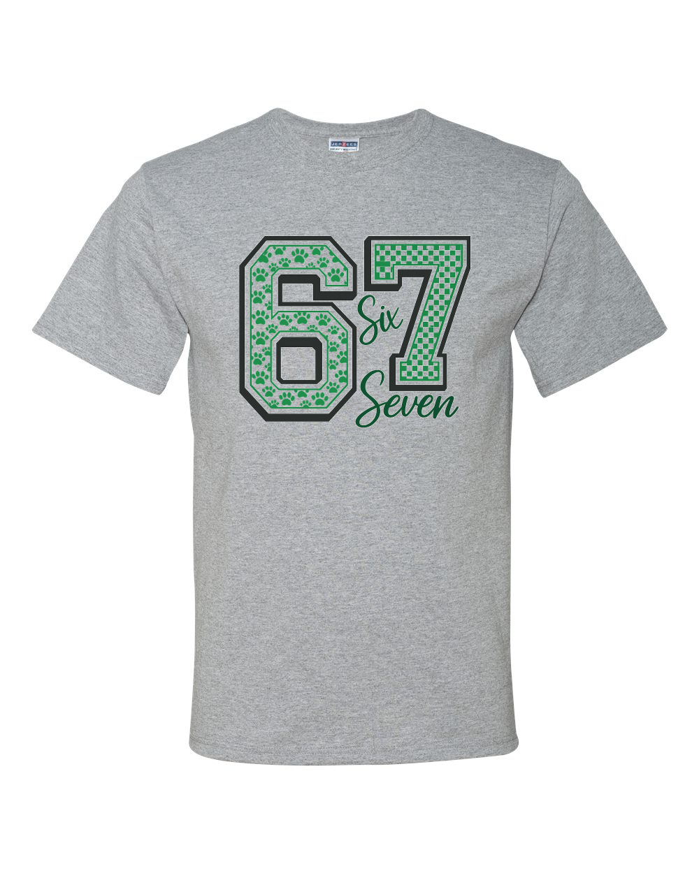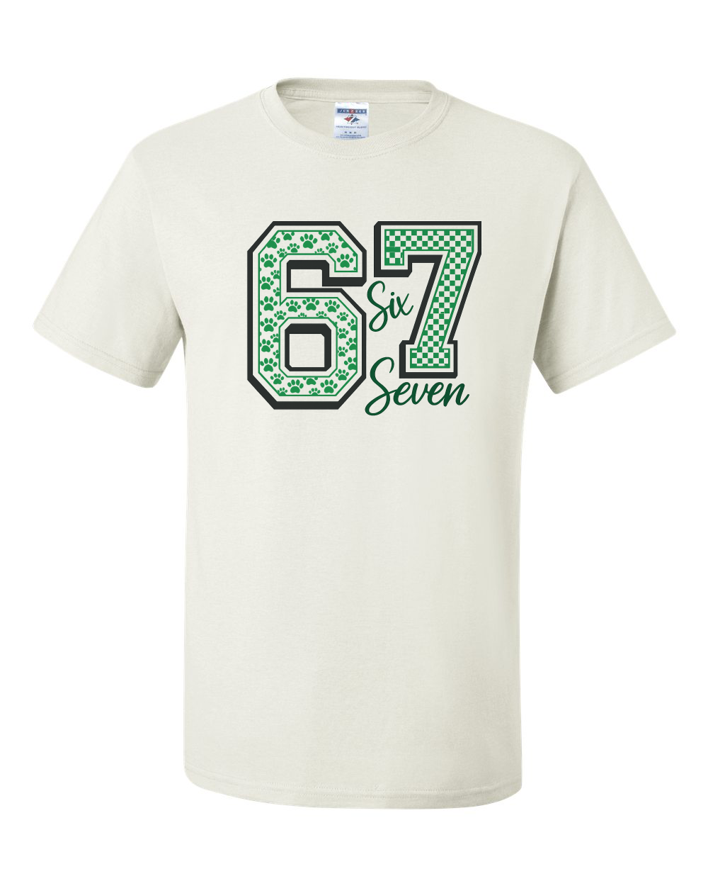 The 67 -The Bulldog Edition takes a simple number and makes it bold. Green bulldog paw detail in the 6. Checkered energy in the 7. Clean black outline. Classic script overlay.