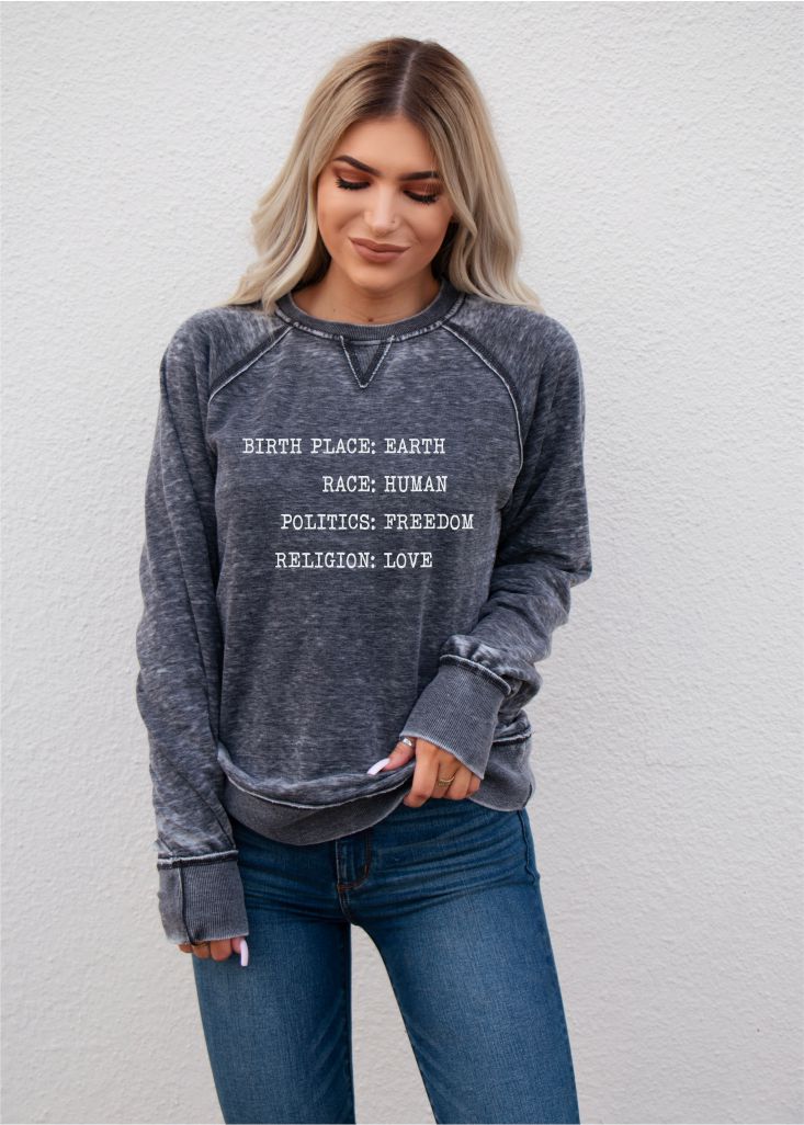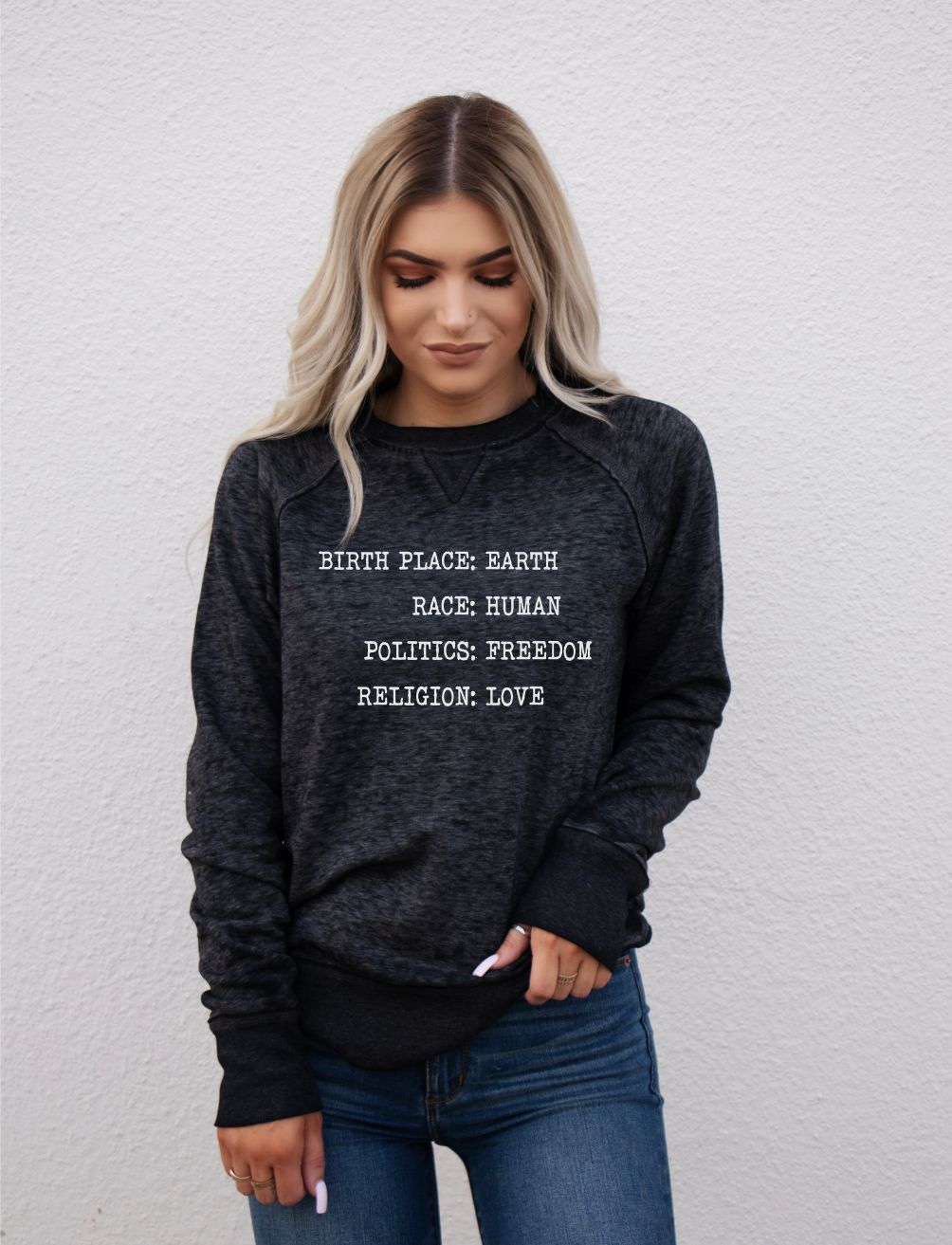 Birthplace: Earth Race: Human Politics: Freedom Religion: Love Vintage Crew Neck Sweatshirt