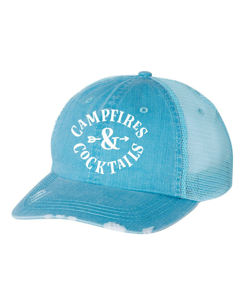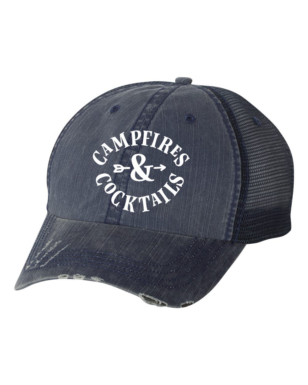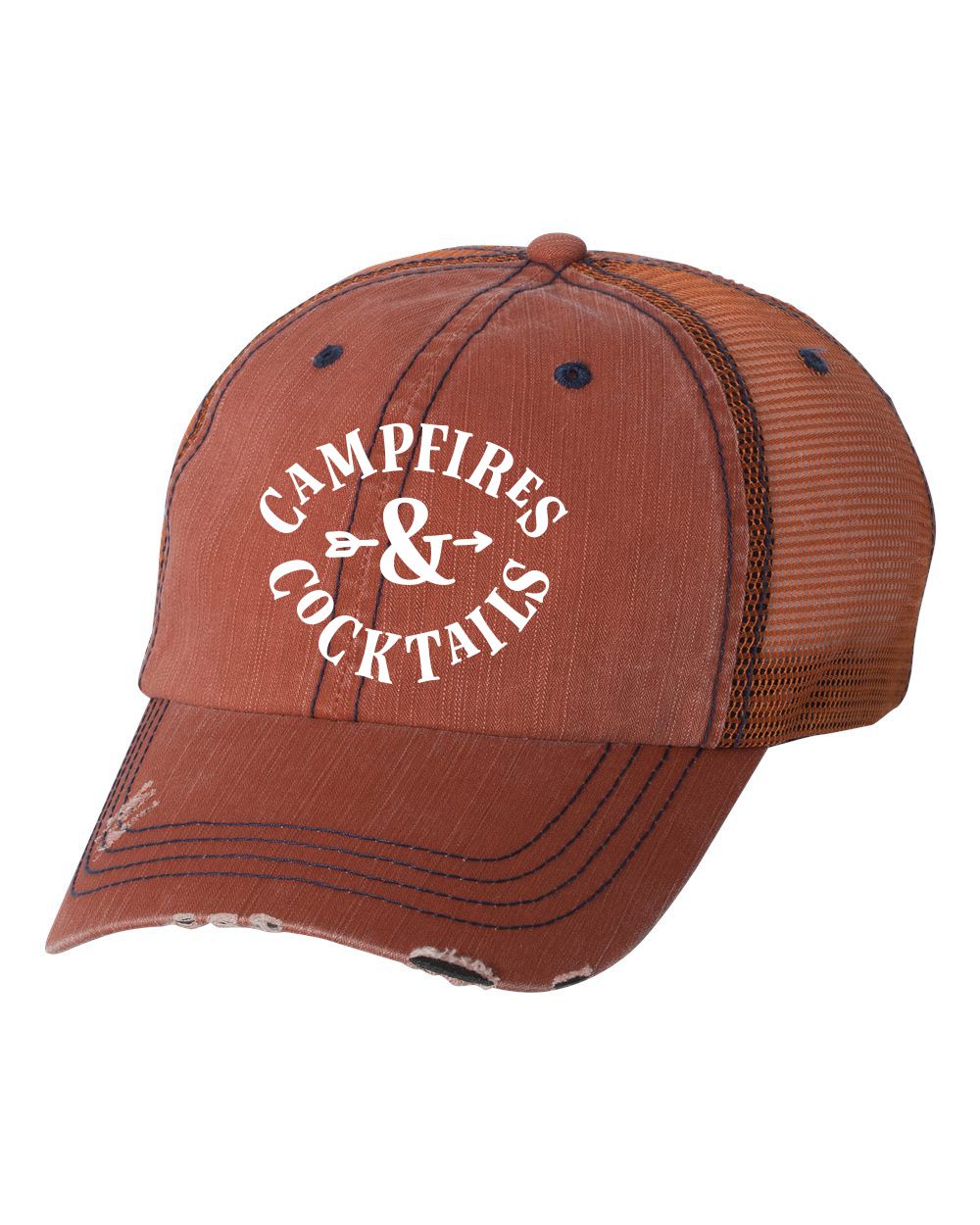 Campfire and Cocktails Trucker hat with mesh back and velcro closing.