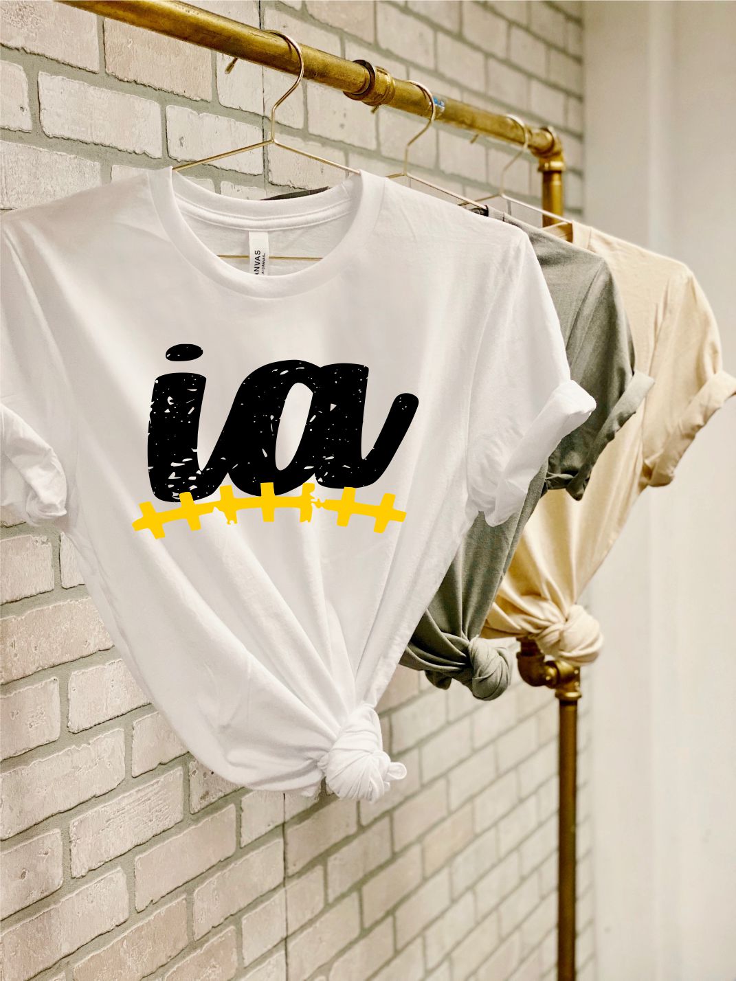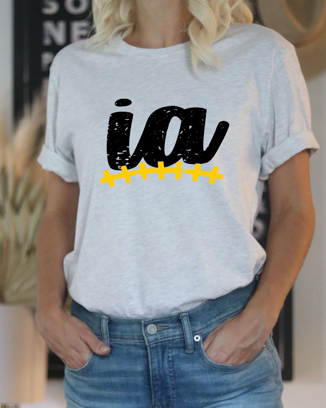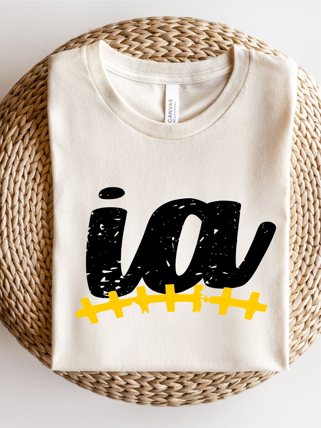 Product Description Iowa IA 2 Color Football Stitch Game Day Tee 100% combed and ring spun cotton Unisex Tee