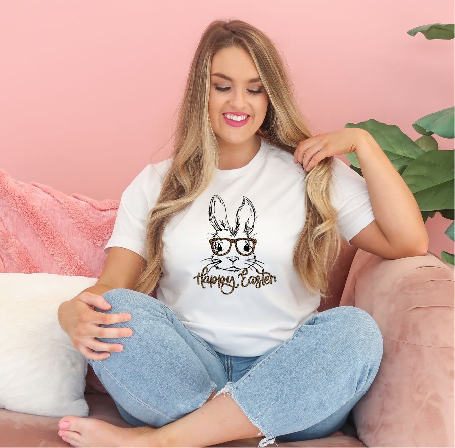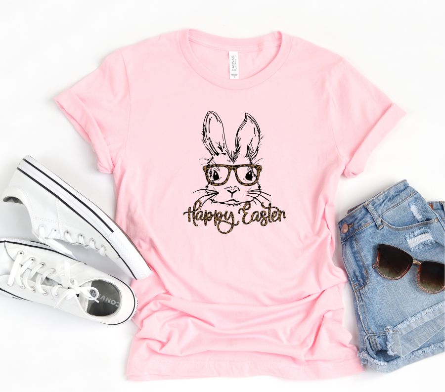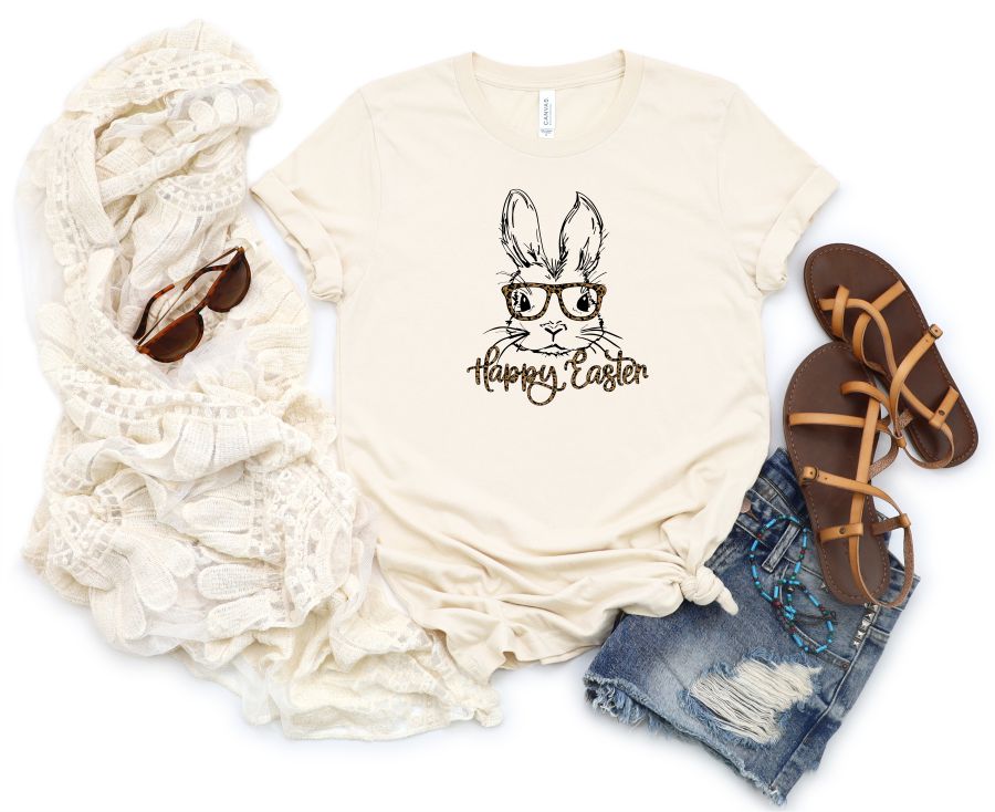 Product Description Leopard Happy Easter Bunny Glasses Graphic Tee 100% combed and ring spun cotton Bella Canvas Unisex Tee