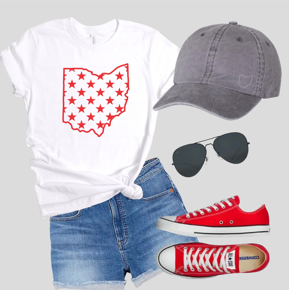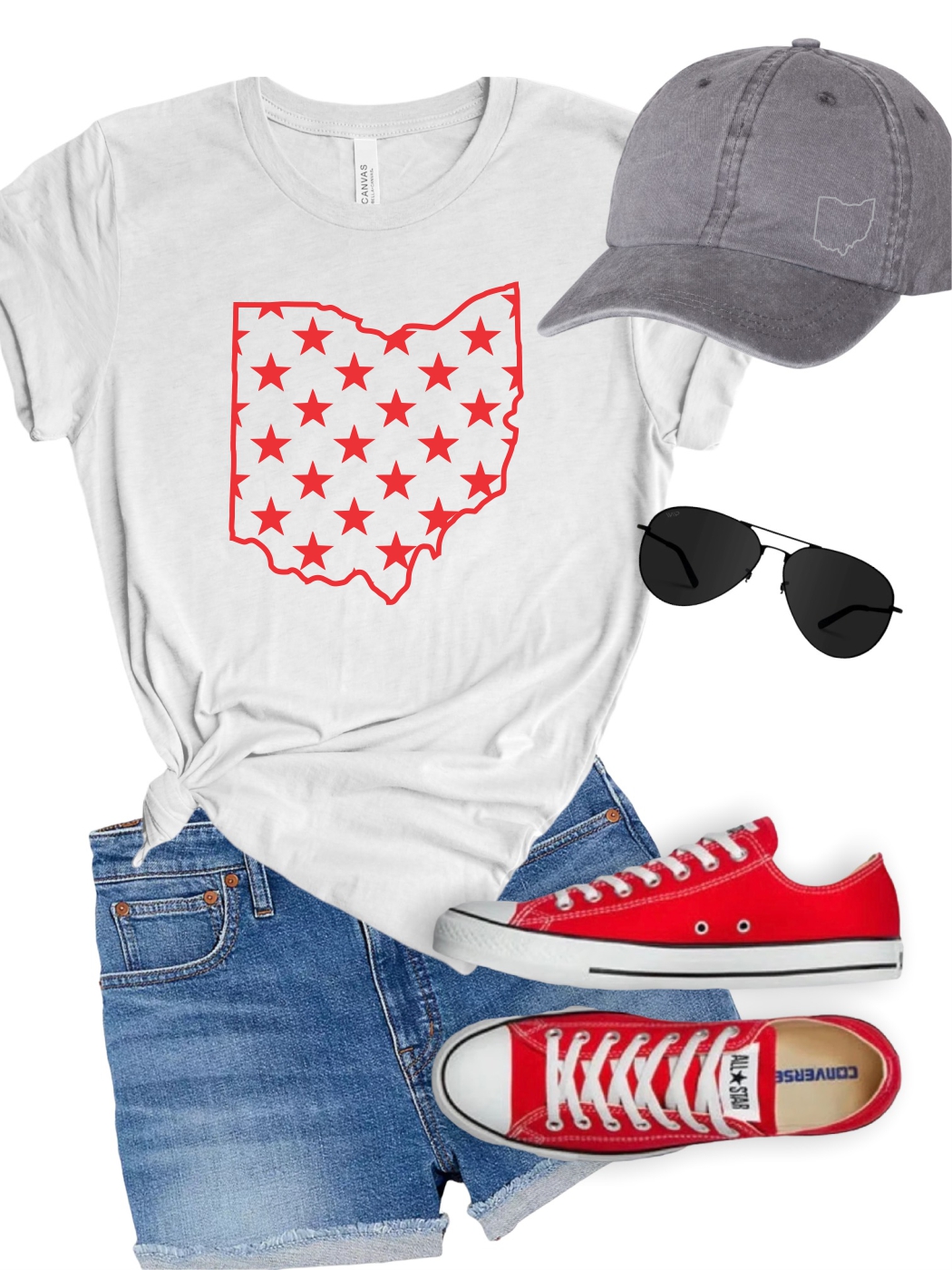 Product Description Red Print Ohio Outline with Stars Crew Neck Tee 100% combed and ring spun cotton Unisex Tee