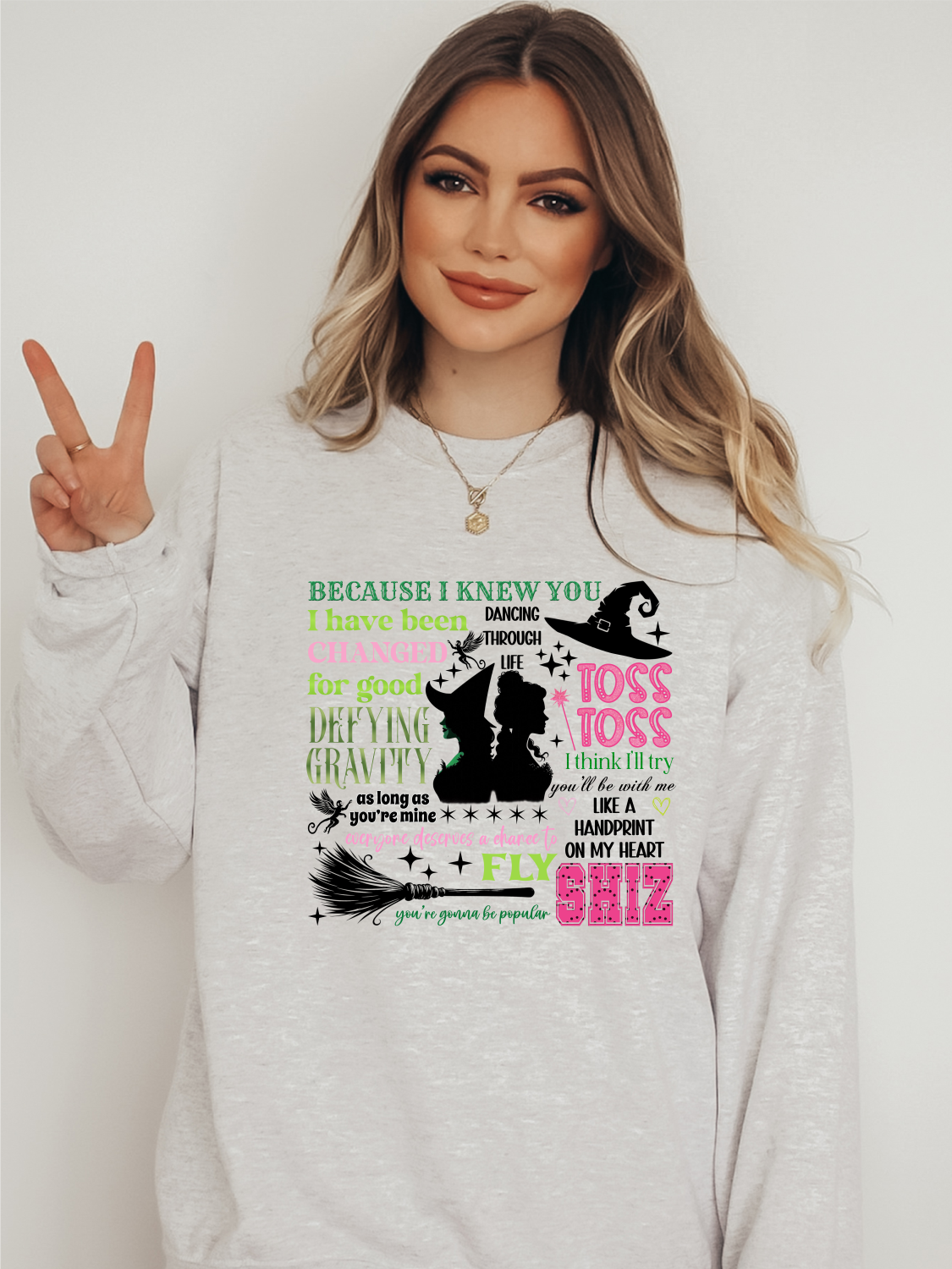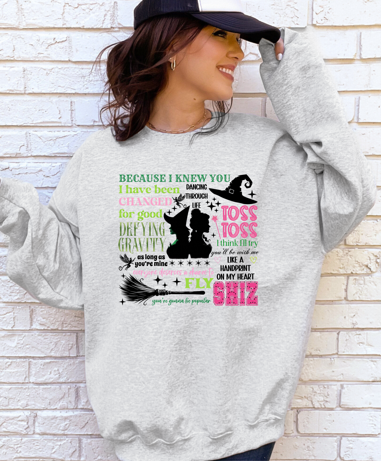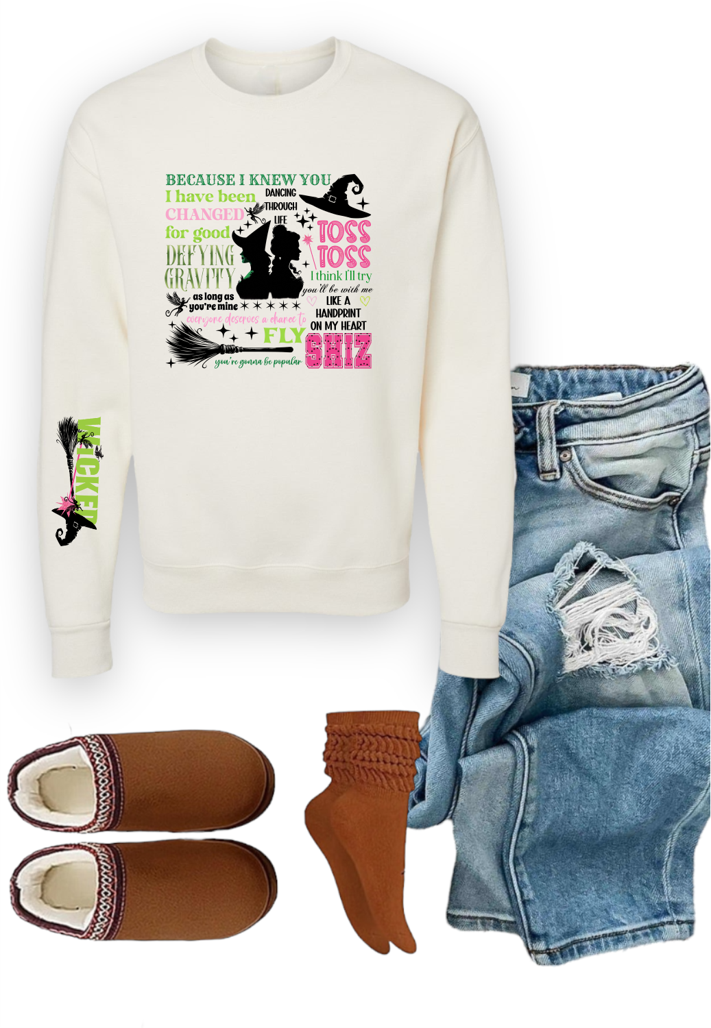 Product Description Witch Songs Graphic Crewneck Sweatshirt All Colors have a sleeve print 50% cotton / 50% polyester